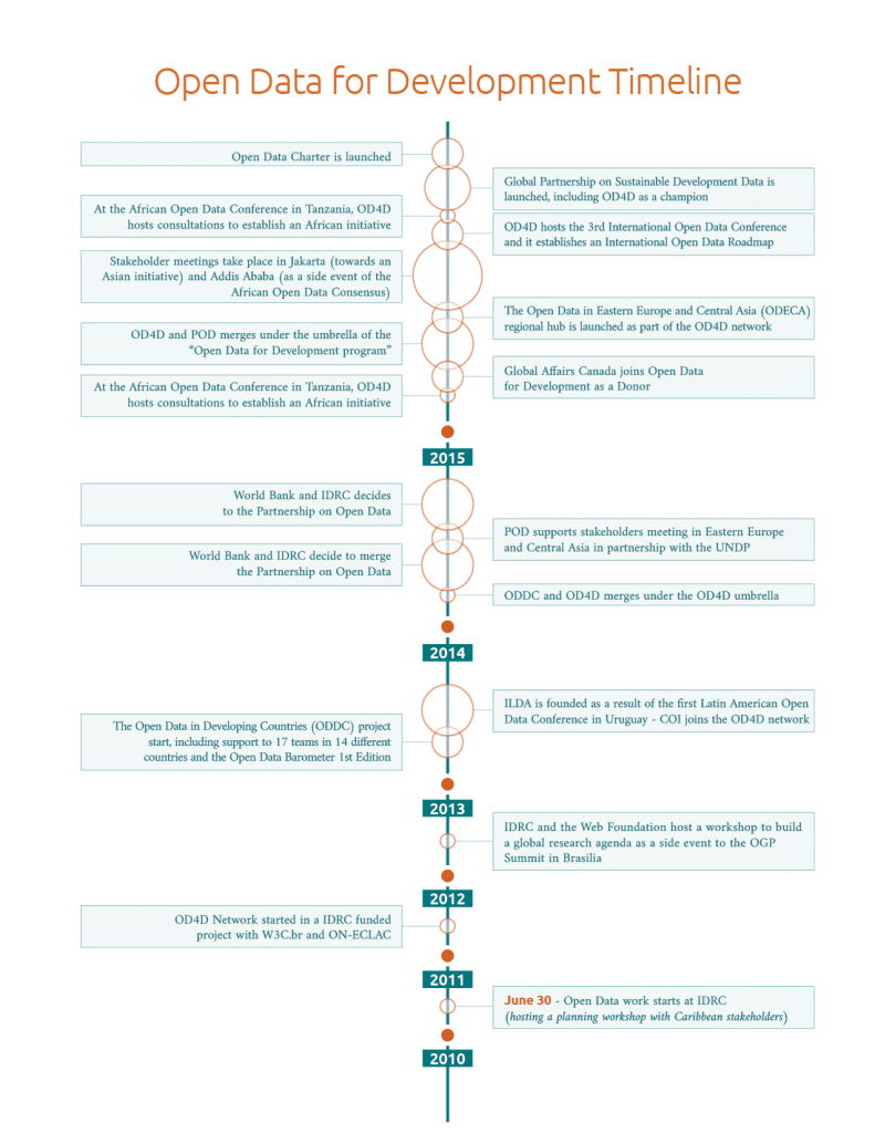 The International Development Research Centre (IDRC) has been working on open data projects dating back to 2010. Various programs were consolidated under the Open Data for Development (OD4D) umbrella in a multi-donor partnership starting in 2015.
