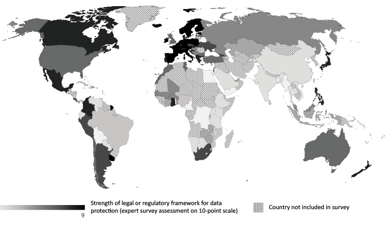 Figure 1: The Open Data Barometer asks about the presence of robust legal or regulatory frameworks for data protection as part of assessing open data readiness. The results illustrate a global divide in the presence of suitable laws and regulations. Source: https://opendatabarometer.org/