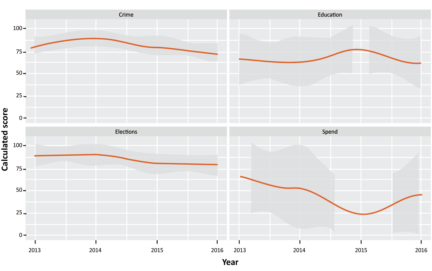 One insight into this trend can be found by looking at comparative international data from the Open Data Barometer.18Examining the results of country-level surveys,19it is possible to explore how 16 data categories are rated on a scale from 1 to 100 based on standardised factors, such as openness, including open licensing, machine readability, cost, and timely updating. Since 2013, several of the data categories have obtained consistent high ratings (e.g. mapping, trade, elections), while others rise (e.g. company) or fall (e.g. spending) due to issues related to outdated or inconsistent published data. These variations aside, the overall picture is one of relative stability (see Figure 1).