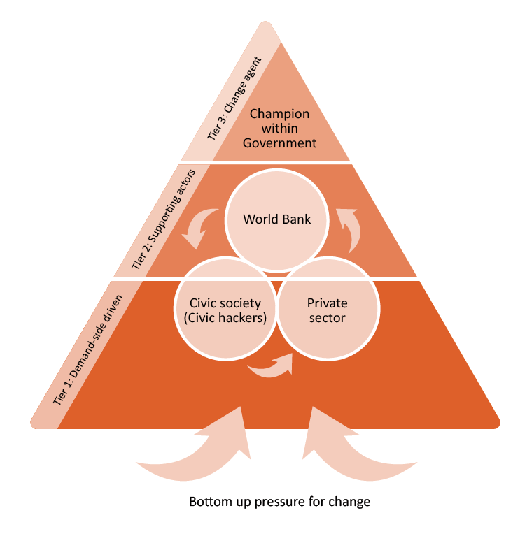 To illustrate the potential interaction of African open data stakeholders, an initial model for the Kenya Open Data ecosystem (see Figure 1) was conceptualised by Rahemtulla et al. for the World Bank in 2012, describing the emerging and fluid relationships between civil society as drivers of demand for open data, development partners as supporting partners, and government officials serving as champions and agents of change.15
