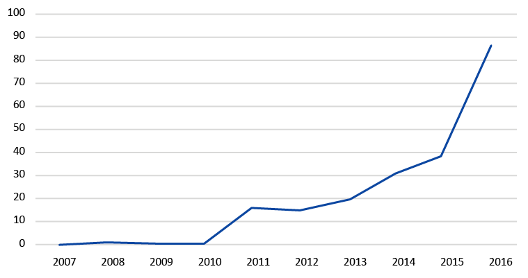 Figure 1: Number of publications on open government data indexed in the Web of Science. 2007–2016 (n=216). Source: Van Schalkwyk & Verhulst (2017).5See also Klein et al. (2017)6who find a similar publication pattern.